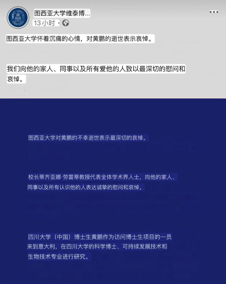 黄鹏选藏大利就读的图西亚大学发文对黄鹏的离世暗意了丧祭