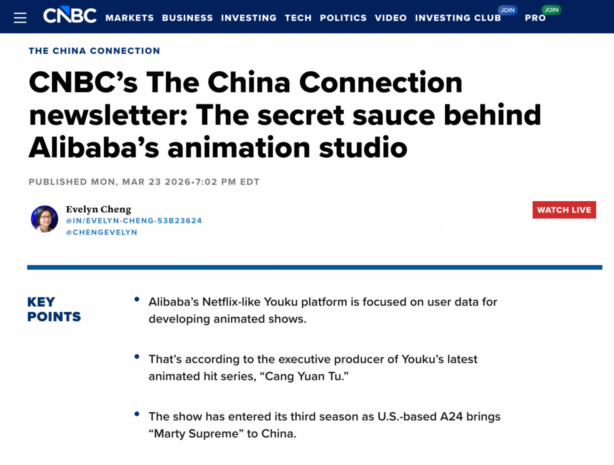 【环球网互娱详细报谈】近日,买卖媒体CNBC发表了对于优酷年番《沧元图》开播及国漫出海的报谈,该报谈发布在CNBC官网及App,行动最新一期聚焦中国买卖新闻的《The China Connection》newsletter主推本体。报谈指出,自2023年《沧元图》第一季播出以来,其在优酷的在追东谈主数已逾越990万。
