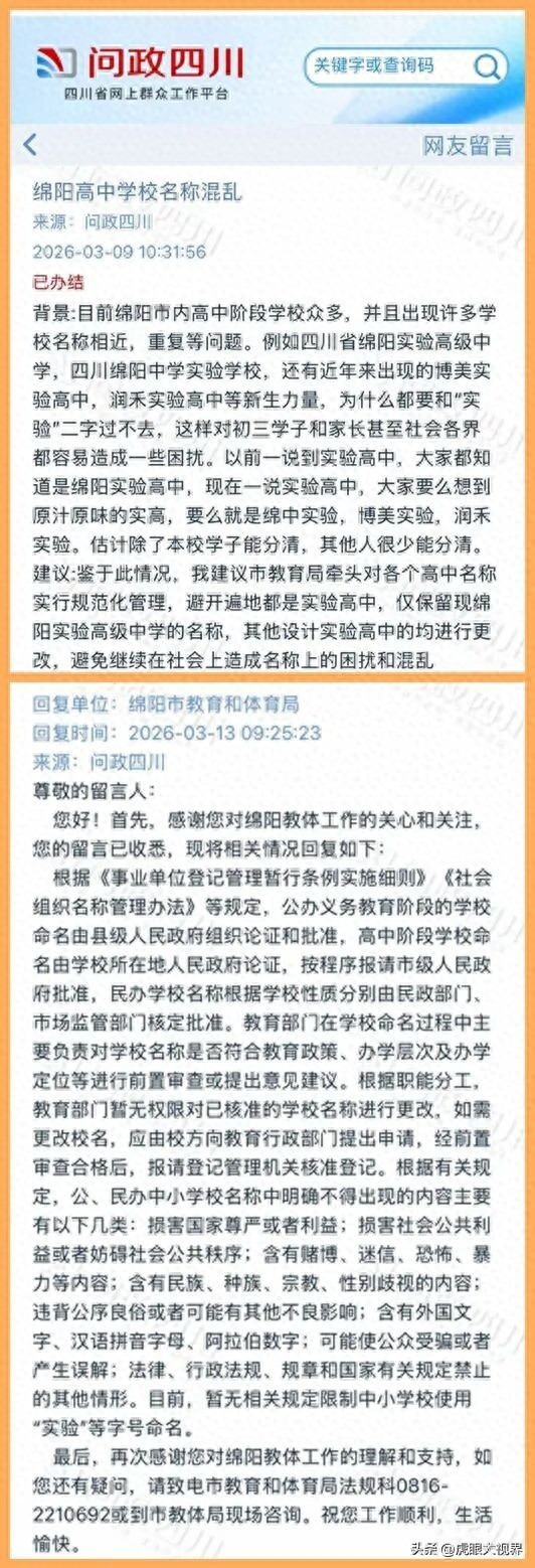 网友建议由市西席局牵头对各个高中称号实行轨范化处置,避让随地齐是实验高中,仅保留现绵阳实验高档中学的称号,其他触及实验高中的均进行改动,幸免不时在社会上形成称号上的困扰和繁杂。