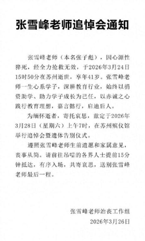 41岁张雪峰枉然离世,治丧组夜深线路悲哀会全细节,他生前日均休眠不足4小时、为犬子提前铺好一世后路的隐情,比犬子故意病更令东说念主破防。