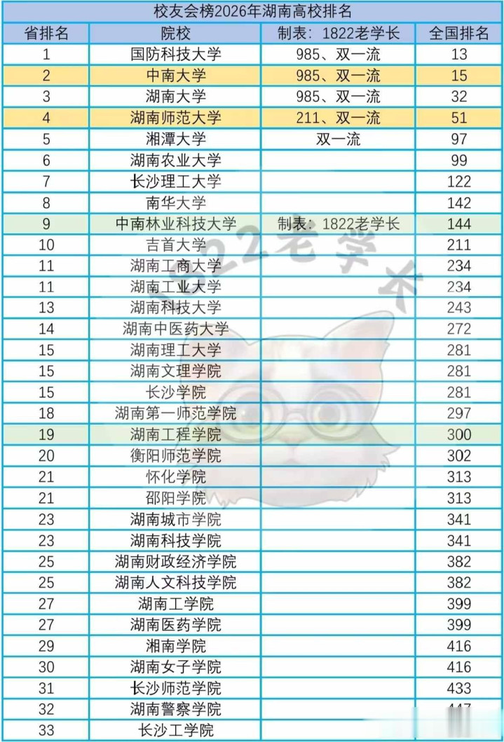 最近看了学友会2026年的大学名次,湖南的高校神色有点不同样,此次把军校也算进去了,国防科技大学平直排进宇宙前十五,中南大学比软科名次往上蹿了十几名,难怪东说念主东说念主皆说,每个榜单皆不同样。