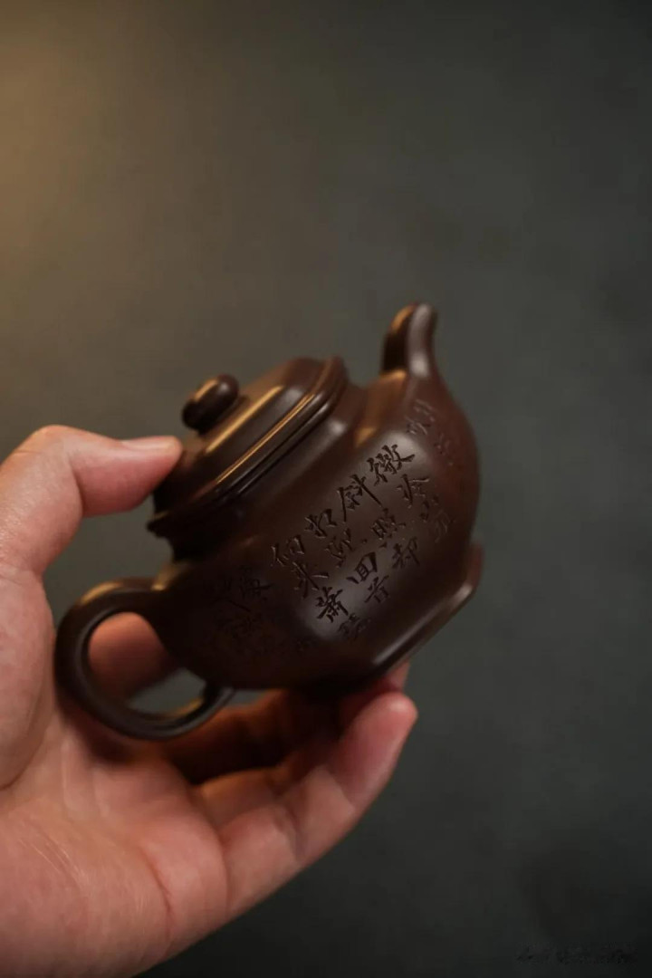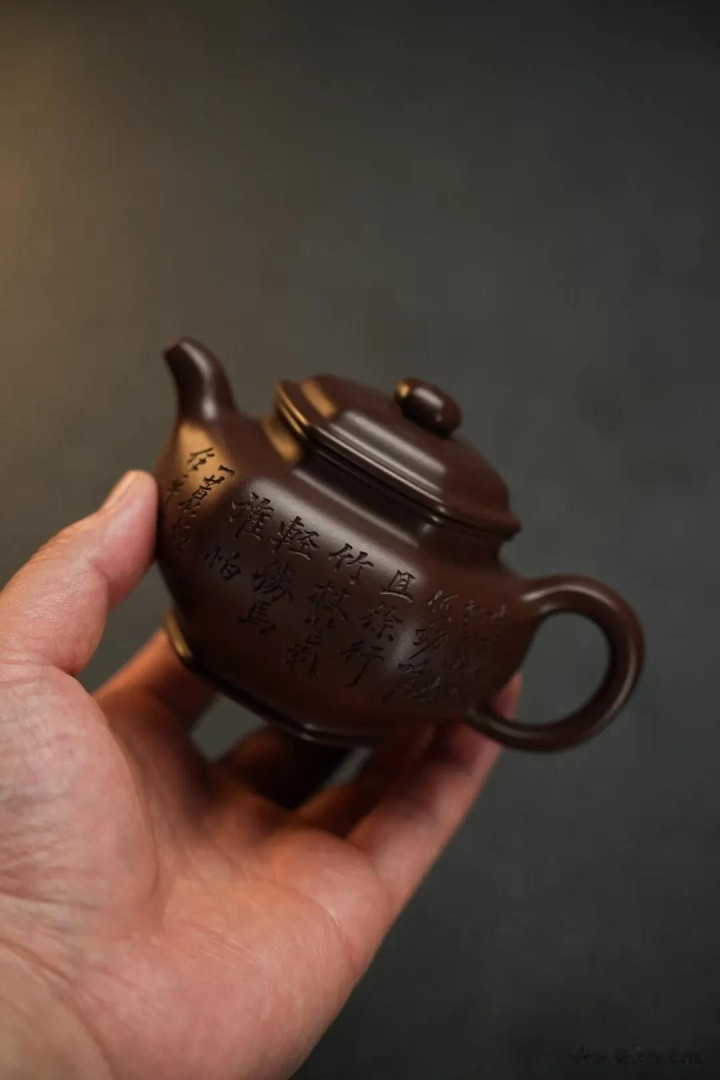 行楷,刀锋安宁,继往开来皆在。刻者莫得炫技,撇捺之间以致带点拙意——恰是这股拙,让字活了过来,不像很多慕古壶上那种刻意仿旧、匠气周身的款识。每次注水,热气氤氲,笔迹便隐入水雾;水落,字又露出。像是苏东坡当年在沙湖谈中遇雨,同业无语,他却不觉;雨霁天青,也无风雨也无晴。这壶陪着我,也从无焦急。