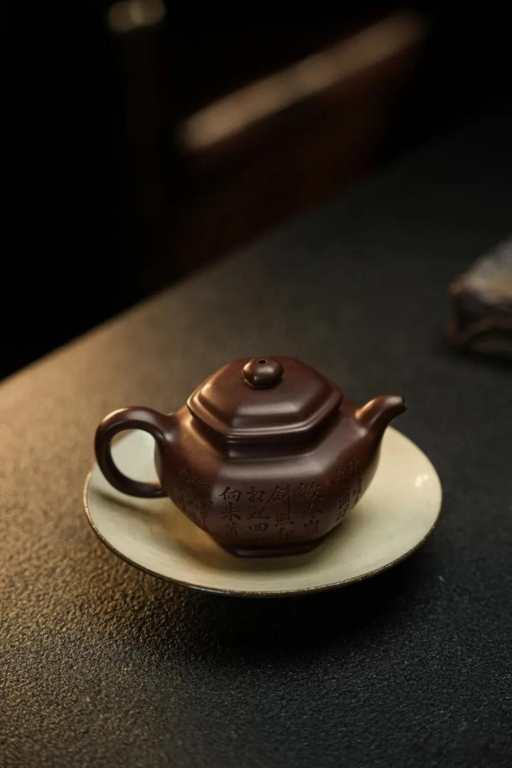 曙光从窗棂斜斜切进来,恰好落在壶身上。六谈棱线被光分红明暗相间的面,像折扇初展时的筋骨。这把壶是慕古款,形制追摹的是邵财主的掇只,却又改成了六方——圆融里生出方正,安分中藏着风骨。泥料是原矿紫泥,还没养开,砂质颗粒隐在胎骨里,像未融的细雪。但指尖抚过盖沿、壶钮、流口,触感也曾温润起来。这是几日朝夕共处换来的,茶汤一遍遍淋过,棉布一次次拭过,紫砂是认东谈主的。