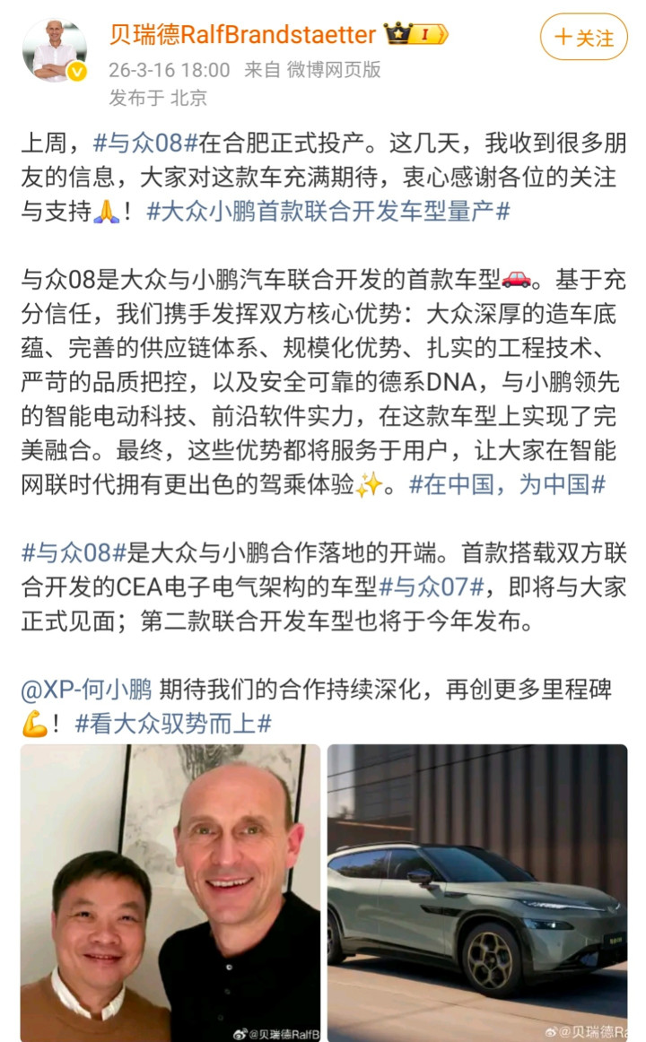 IT之家3月16日音信,当天,内行汽车集团(中国)董事长兼首席引申官贝瑞德发文暗示,上周,与众08在合肥融会投产。这是内行与小鹏结合落地的最先,首款搭载两边聚拢成就的CEA电子电气架构的车型与众07,行将与群众融会碰面;第二款聚拢成就车型也将于本年发布。