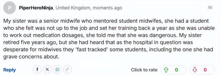 “我姐姐是一位资深助产士,负责辅导实习助产士。她也曾遭遇过一位实习生,她合计这位实习生的才气不足,甚而因为无法猜测药物剂量而延迟了一年的培训。