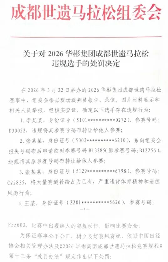 通报表露:李某某,参赛号码D30022,违章将其参赛号码布转让给他东谈主参赛。对其取消获利及名次,并毕生退却该选手参预成齐世遗马拉松,同期将违章选手信息材料上报中国田径协会肯求追加措置。