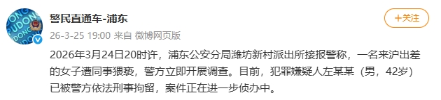 2026年3月24日20时许,浦东公本分局潍坊新村派出所接报警称,别称来沪出差的女子遭共事猥亵,Z6尊龙凯时官方网站警方立即开展拜谒。当今,违警嫌疑东说念主左某某(男,42岁)已被警方照章刑事拘留,案件正在进一步侦办中。